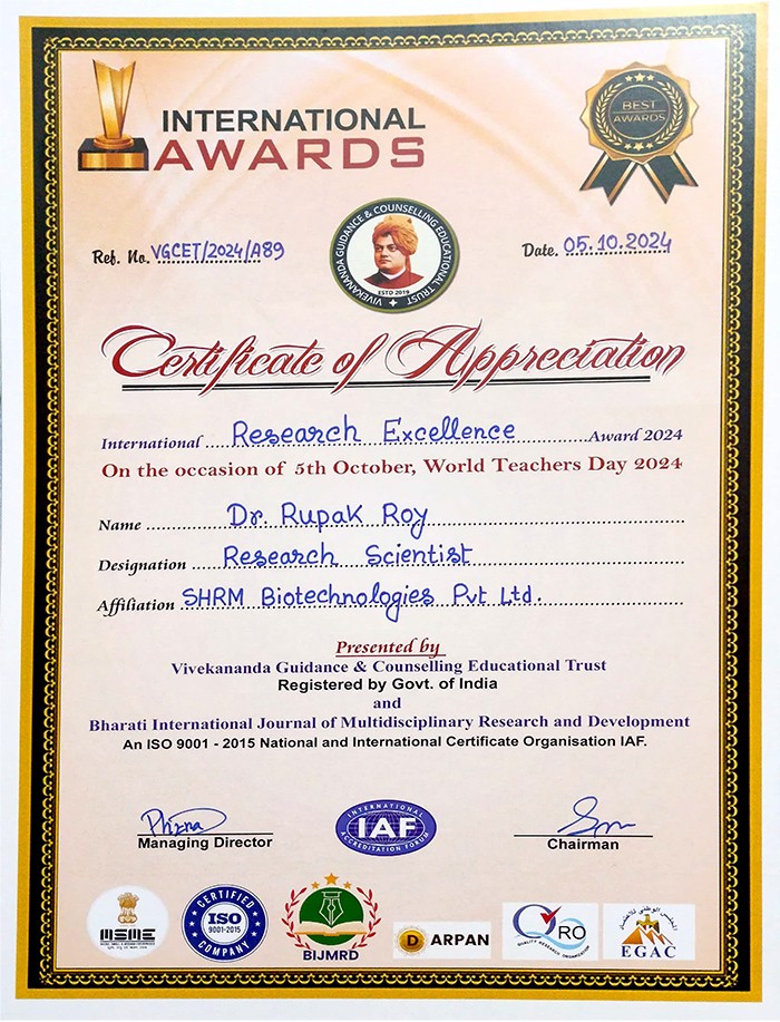 Dr. Rupak Roy (Research Scientist) receiving the certificate at the "Leadership Conclave-2022", on behalf of the SHRM Biotechnologies Pvt. Ltd. organized by ASSOCHAM